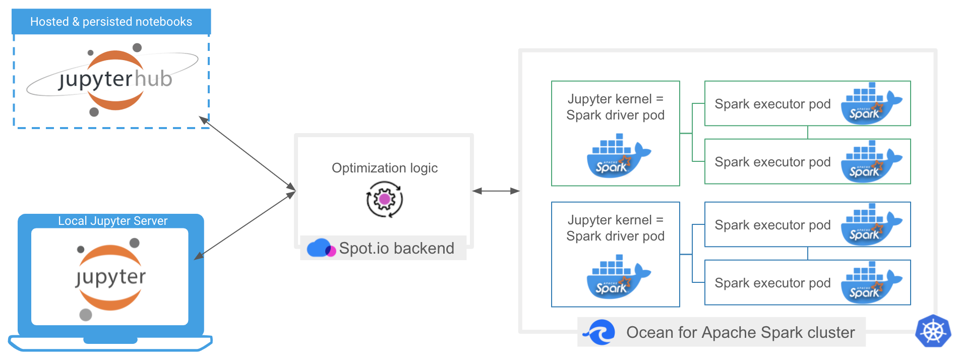 Ocean Spark’s integration with Jupyter Notebooks enables you to run Jupyter kernels with Spark support on an Ocean Spark cluster. You can connect your notebooks from a Jupyter or Jupyterlab server running locally or from a hosted JupyterHub.