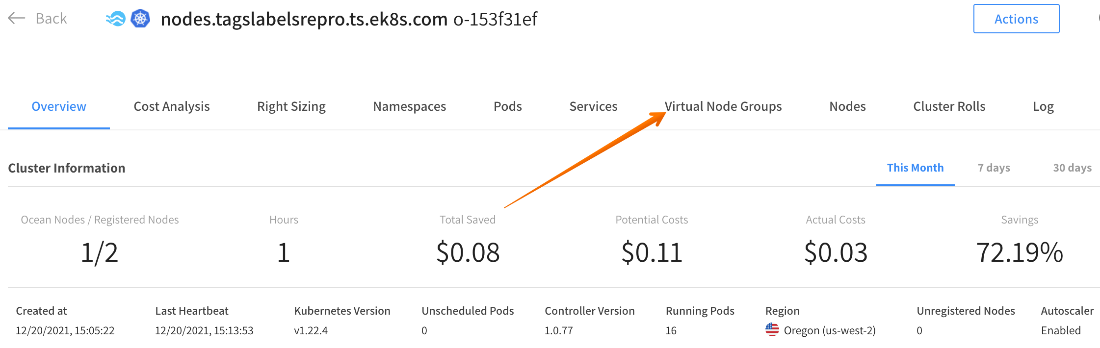 In your Ocean cluster, click the Virtual Node Groups tab.