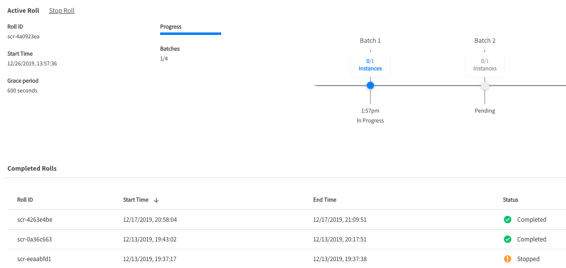 STOPPED: The user manually stopped the roll. Nodes retain their current state when stopped, with no rollback to the initial configuration.