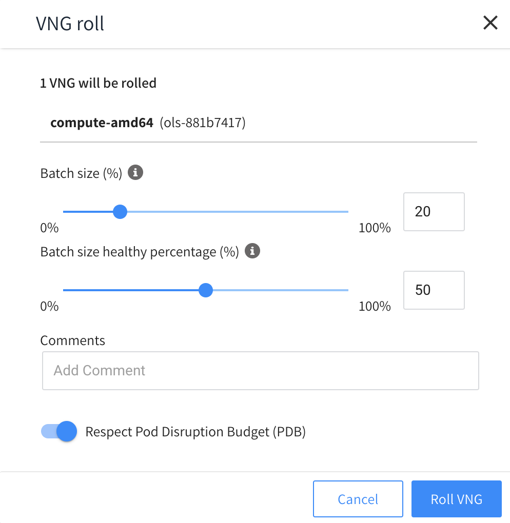 Enter the Batch Size and Comments, indicate whether you want to respect the pod disruption budget, and click Roll VNG(s).